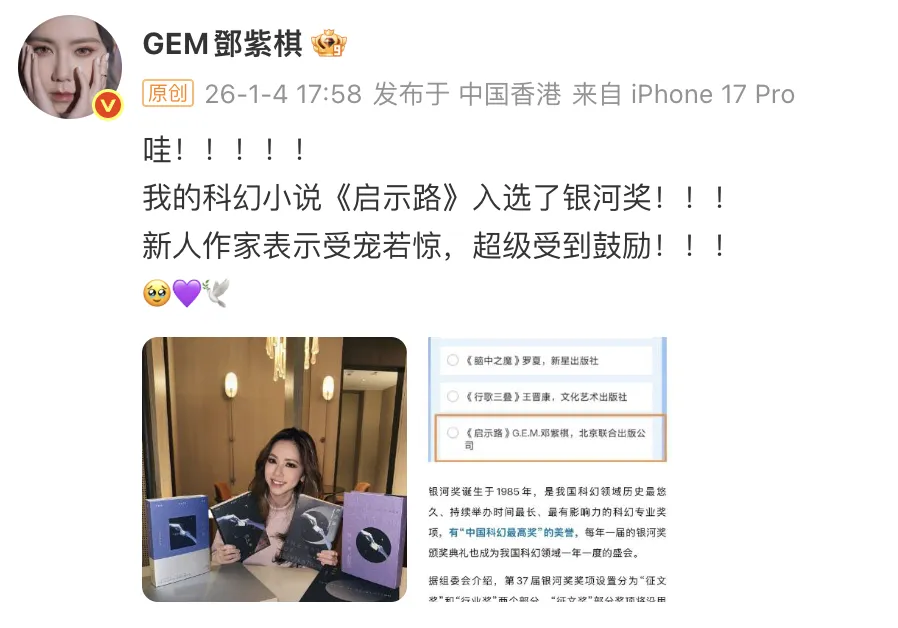 昨天(1月4日)傍晚,邓紫棋通过社交平台发文:我的科幻小说《启示路》入选了银河奖,新人作家表示受宠若惊,超级受到鼓励!