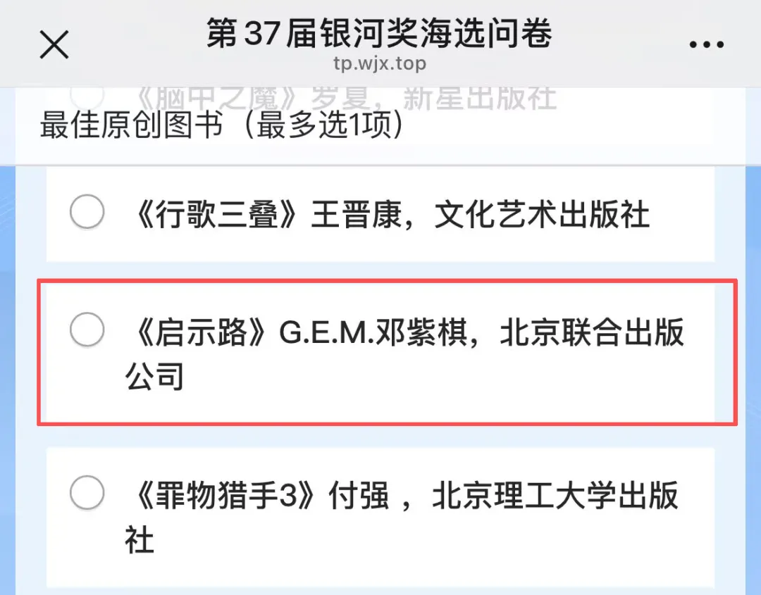 记者发现,知名歌手邓紫棋于2025年出版的科幻小说《启示路》现身第37届“银河奖”最佳原创图书奖项初选投票名单,消息引发全网热议。